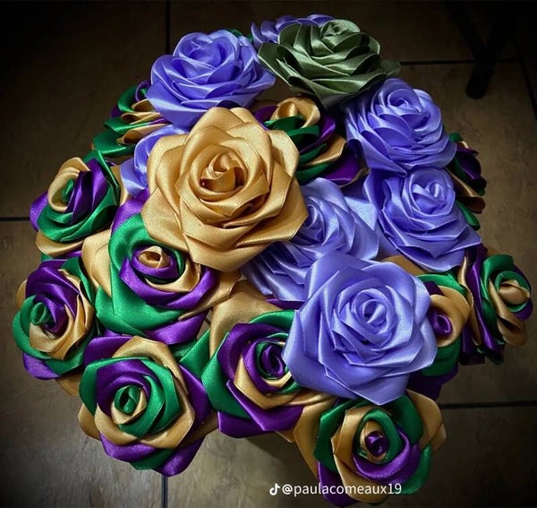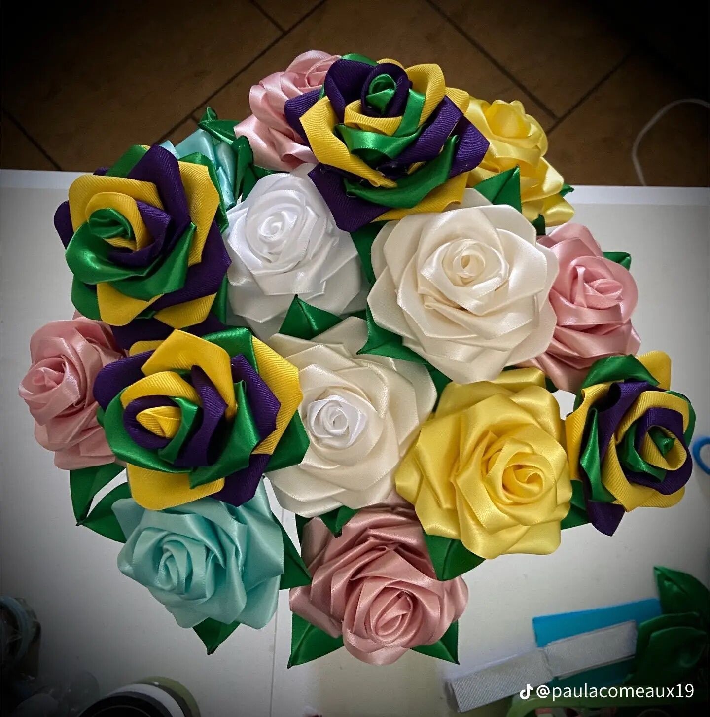 Elegance in Every Fold — This stunning bouquet of handmade satin ribbon roses bursts with vibrant charm and intricate detail. Featuring a rich palette of gold, lavender, green, and deep purple, each bloom is carefully crafted to showcase the artistry and care behind every petal. Perfect as a lasting gift, eye-catching centerpiece, or unique décor accent, this arrangement brings timeless beauty with a personal touch.